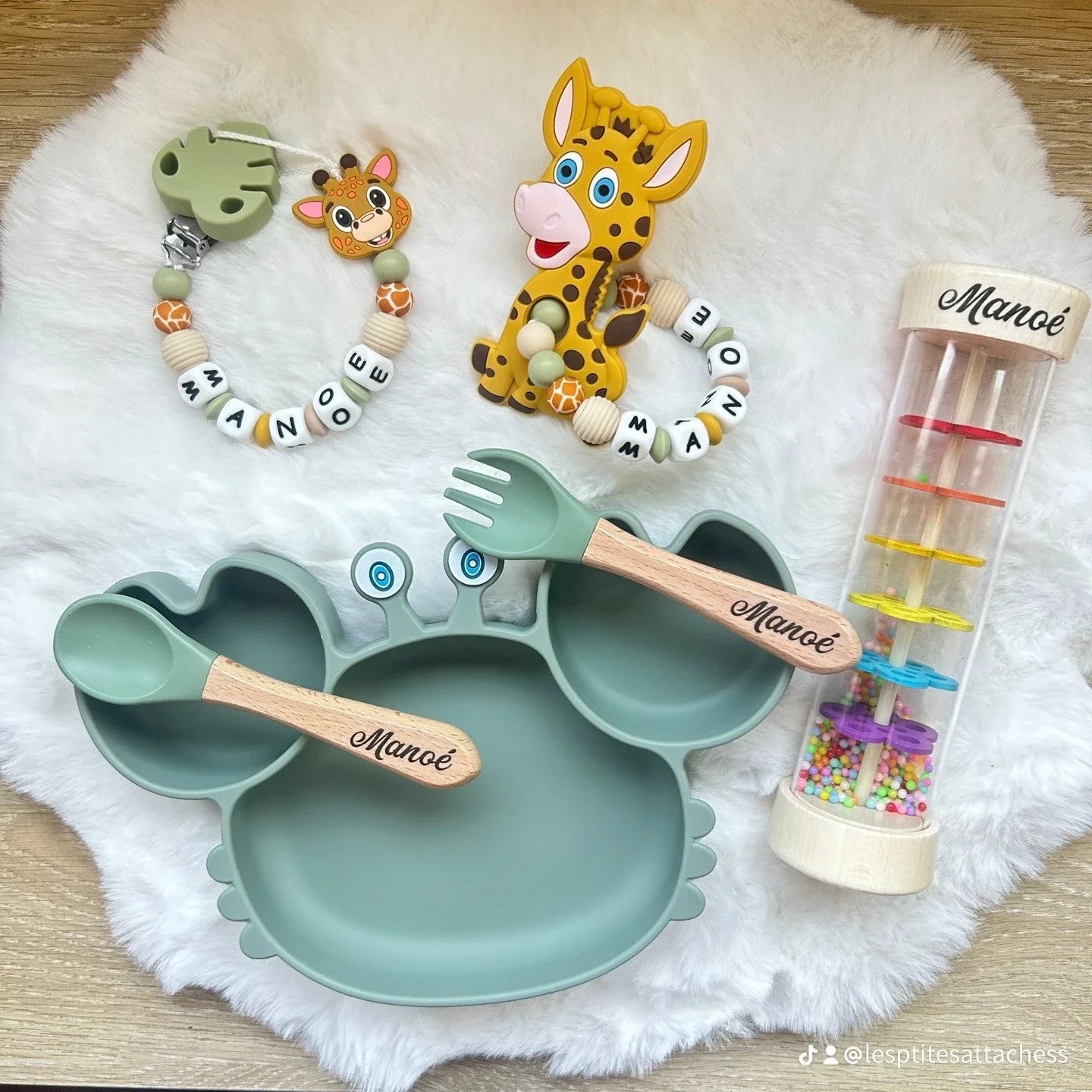 Une assiette crabe anti-renversement et deux couverts personnalisés.