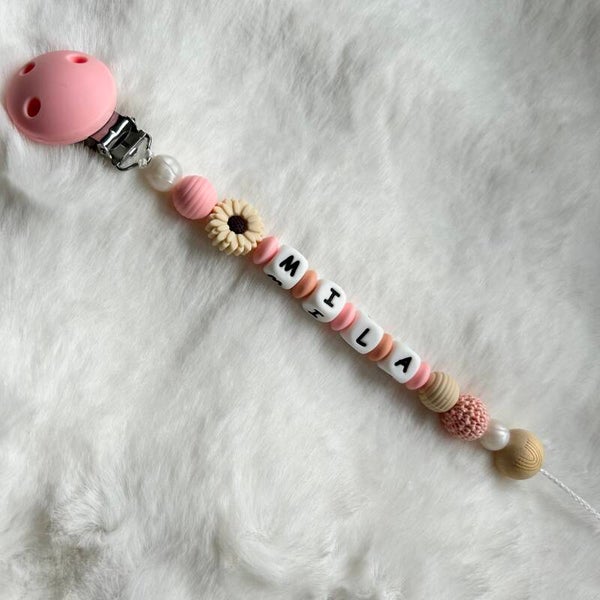 Une jolie attache-tétine fleurie, dans les tons rose et beige.
