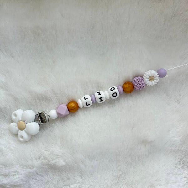 Une jolie attache tétine fleurie dans les tons lilas.