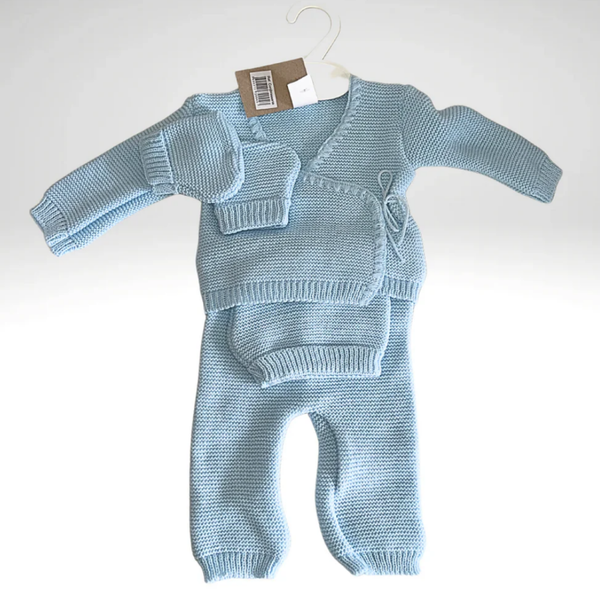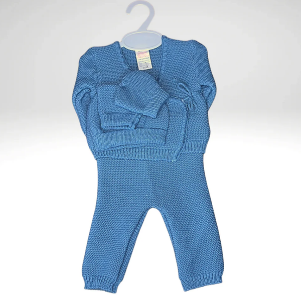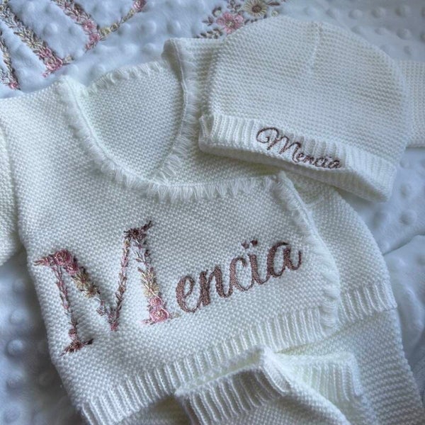 Un joli ensemble en maille à personnaliser composé d'un pantalon, d'un haut cache-coeur, d'un bonnet et de chaussons.