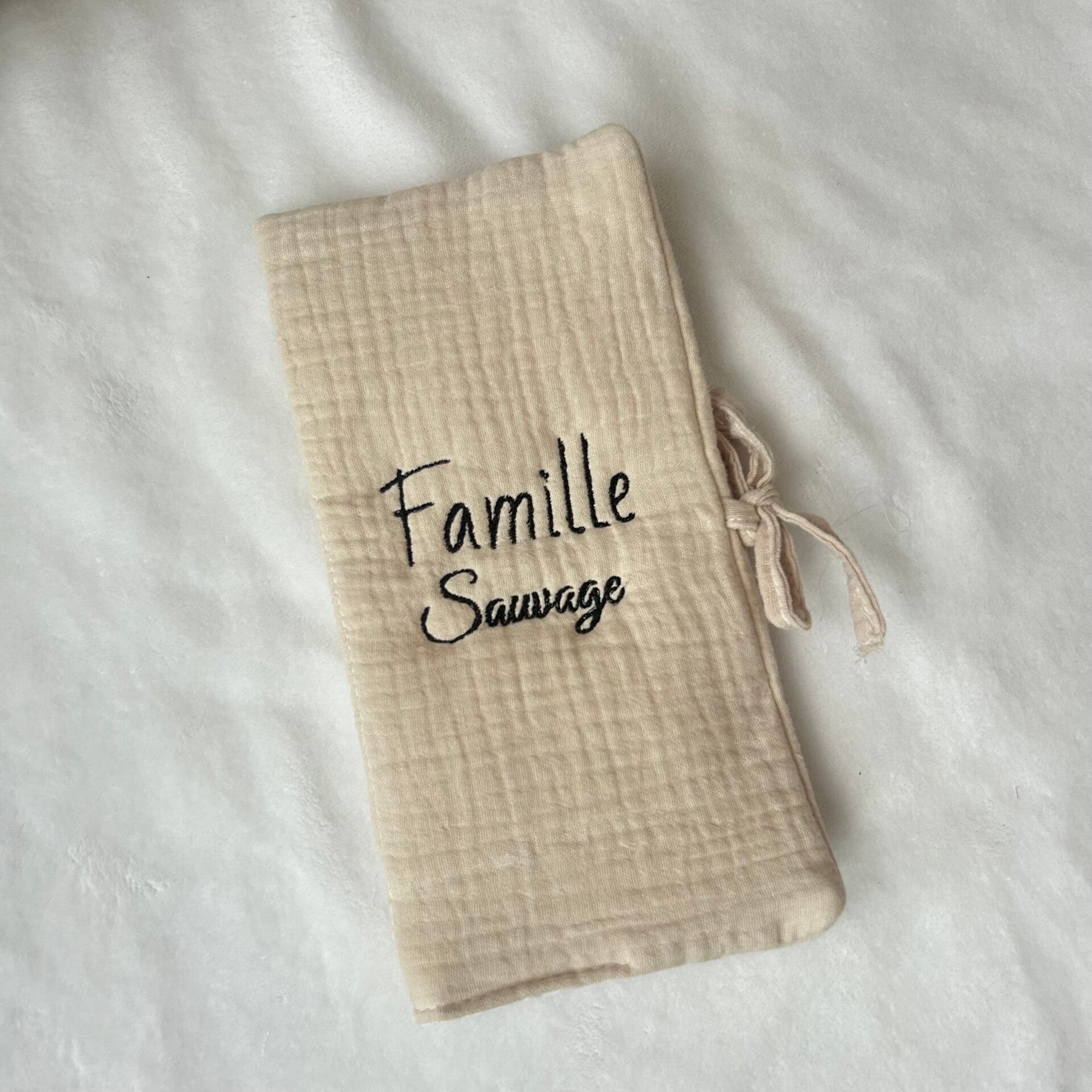 Un joli protège livret de famille en gaze de coton, personnalisé avec une petite phrase, un nom de famille ou un surnom selon vos envies.