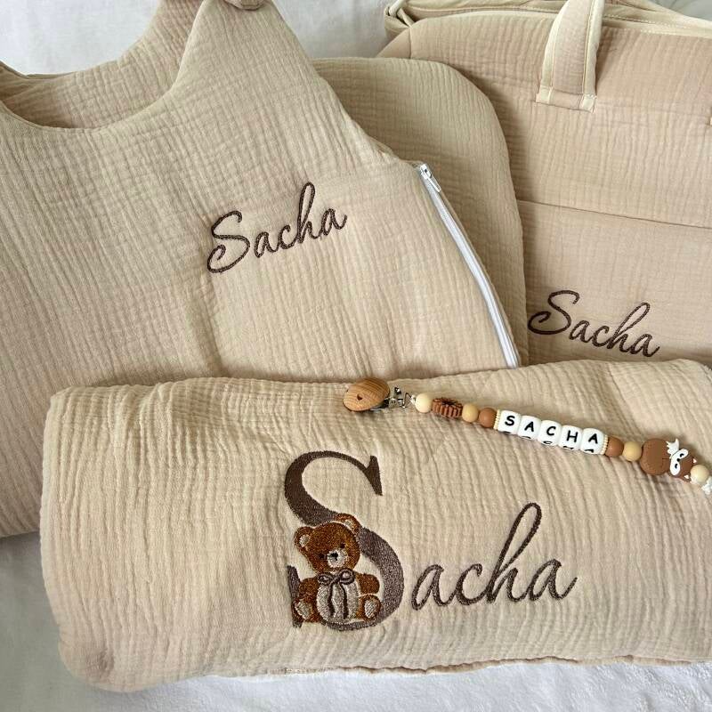Un joli plaid en gaze de coton brodé selon vos goûts et vos envies + une attache tétine brodée OFFERTE.